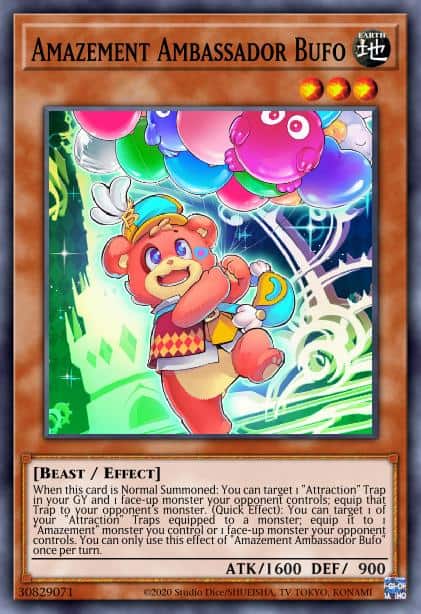 When this card is Normal Summoned: You can target 1 “Attraction” Trap in your GY and 1 face-up monster your opponent controls; equip that Trap to your opponent’s monster. (Quick Effect): You can target 1 of your “Attraction” Traps equipped to a monster; equip it to 1 “Amazement” monster you control or 1 face-up monster your opponent controls. You can only use this effect of “Amazement Ambassador Bufo” once per turn.