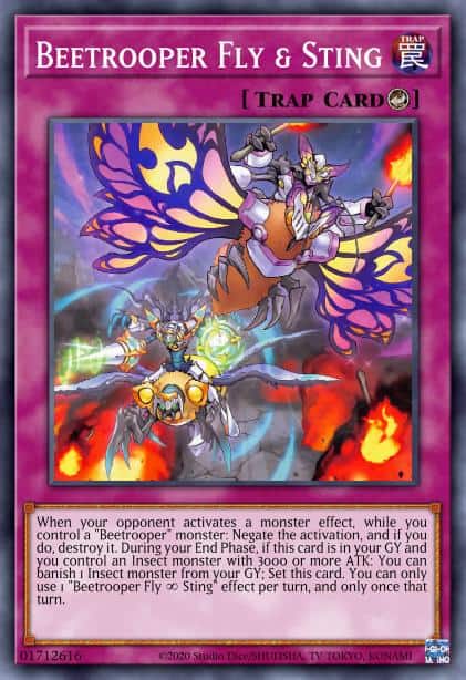 When your opponent activates a monster effect, while you control a “Beetrooper” monster: Negate the activation, and if you do, destroy it. During your End Phase, if this card is in your GY and you control an Insect monster with 3000 or more ATK: You can banish 1 Insect monster from your GY; Set this card. You can only use 1 “Beetrooper Fly & Sting” effect per turn, and only once that turn.