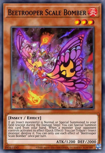 If an Insect monster(s) is Normal or Special Summoned to your field (except during the Damage Step): You can Special Summon this card from your hand. When a monster your opponent controls activates its effect (Quick Effect): You can Tribute 1 Insect monster; destroy it. You can only use each effect of “Beetrooper Scale Bomber” once per turn.