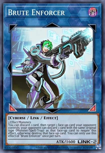 You can discard 1 card, then target 1 face-up card your opponent controls; your opponent can discard 1 card with the same original card type (Monster, Spell, or Trap) as that face-up card to negate this effect, otherwise destroy that face-up card. You can only use this effect of “Brute Enforcer” once per turn.