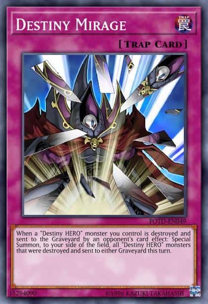 When a “Destiny HERO” monster you control is destroyed and sent to the Graveyard by an opponent’s card effect: Special Summon, to your side of the field, all “Destiny HERO” monsters that were destroyed and sent to either Graveyard this turn.