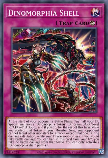 At the start of your opponent’s Battle Phase: Pay half your LP; Special Summon 1 “Dinomorphia Token” (Dinosaur/DARK/Level 10/ATK 0/DEF 3000), and if you do, for the rest of this turn, while you control that Token in your Monster Zone, your opponent cannot target other monsters for attacks, except that one. During damage calculation, while your LP are 2000 or less, if you would take battle damage: You can banish this card from your GY; you take no battle damage from that battle. You can only activate 1 “Dinomorphia Shell” per turn.