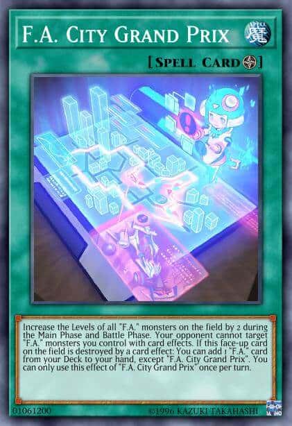 Increase the Levels of all “F.A.” monsters on the field by 2 during the Main Phase and Battle Phase. Your opponent cannot target “F.A.” monsters you control with card effects. If this face-up card on the field is destroyed by a card effect: You can add 1 “F.A.” card from your Deck to your hand, except “F.A. City Grand Prix”. You can only use this effect of “F.A. City Grand Prix” once per turn.