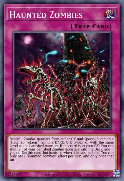 Banish 1 Zombie monster from either GY and Special Summon 2 “Haunted Tokens” (Zombie/DARK/ATK 0/DEF 0) with the same Level as the banished monster. If this card is in your GY: You can shuffle 1 of your banished Zombie monsters into the Deck, and if you do, Set this card, but banish it when it leaves the field. You can only use 1 “Haunted Zombies” effect per turn, and only once that turn.