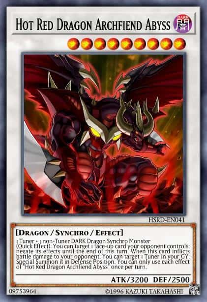 (Quick Effect): You can target 1 face-up card your opponent controls; negate its effects until the end of this turn. When this card inflicts battle damage to your opponent: You can target 1 Tuner in your GY; Special Summon it in Defense Position. You can only use each effect of “Hot Red Dragon Archfiend Abyss” once per turn.