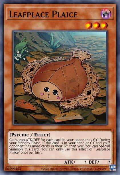Gains 200 ATK/DEF for each card in your opponent’s GY. During your Standby Phase, if this card is in your hand or GY and your opponent has more cards in their GY than you: You can Special Summon this card. You can only use this effect of “Leafplace Plaice” once per turn.