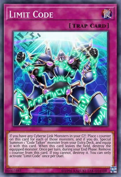 If you have any Cyberse Link Monsters in your GY: Place 1 counter on this card for each of those monsters, and if you do, Special Summon 1 “Code Talker” monster from your Extra Deck, and equip it with this card. When this card leaves the field, destroy the equipped monster. Once per turn, during your End Phase: Remove 1 counter from this card. If you cannot, destroy it. You can only activate “Limit Code” once per Duel.