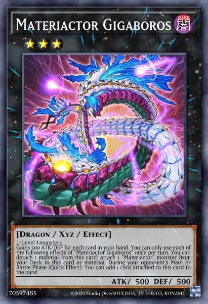 Gains 500 ATK/DEF for each card in your hand. You can only use each of the following effects of “Materiactor Gigaboros” once per turn. You can detach 1 material from this card; attach 1 “Materiactor” monster from your Deck to this card as material. During your opponent’s Main or Battle Phase (Quick Effect): You can add 1 card attached to this card to the hand.