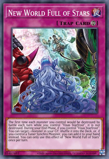 While you control “Visas Starfrost”, the first time each monster you control would be destroyed by battle each turn, it is not destroyed. During your End Phase, if you control “Visas Starfrost”: You can target 1 monster in your GY; shuffle it into the Deck, or, if you control a Tuner Synchro Monster, you can add it to your hand instead. You can only use this effect of “New World Stars” once per turn.