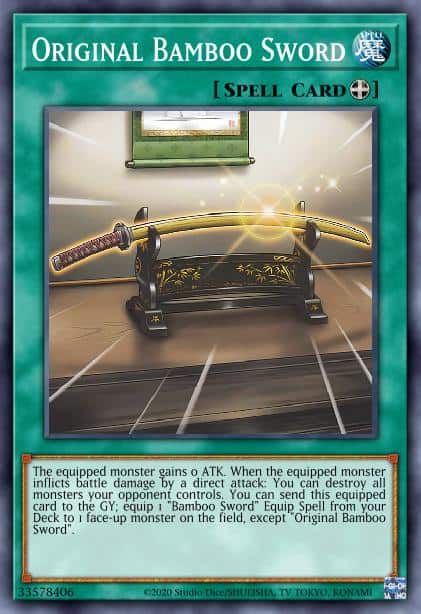 The equipped monster gains 0 ATK. When the equipped monster inflicts battle damage by a direct attack: You can destroy all monsters your opponent controls. You can send this equipped card to the GY; equip 1 “Bamboo Sword” Equip Spell from your Deck to 1 face-up monster on the field, except “Original Bamboo Sword”.