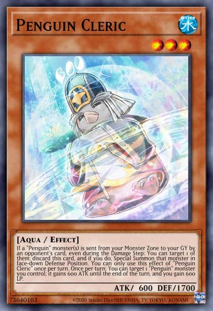If a “Penguin” monster(s) is sent from your Monster Zone to your GY by an opponent’s card, even during the Damage Step: You can target 1 of them; discard this card, and if you do, Special Summon that monster in face-down Defense Position. You can only use this effect of “Penguin Cleric” once per turn. Once per turn: You can target 1 “Penguin” monster you control; it gains 600 ATK until the end of the turn, and you gain 600 LP.