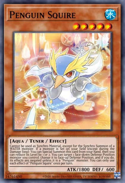 Cannot be used as Synchro Material, except for the Synchro Summon of a WATER monster. If a monster is Set on your field (except during the Damage Step): You can Special Summon this card from your hand, then you can reduce its Level by 1 or 2. You can target 1 face-down Defense Position monster you control; change it to face-up Defense Position, and if you do, its effects are negated unless it is a “Penguin” monster. You can only use each effect of “Penguin Squire” once per turn.