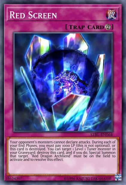 Your opponent’s monsters cannot declare attacks. During each of your End Phases, you must pay 1000 LP (this is not optional), or this card is destroyed. You can target 1 Level 1 Tuner monster in your Graveyard; destroy this card, and if you do, Special Summon that target. “Red Dragon Archfiend” must be on the field to activate and to resolve this effect.