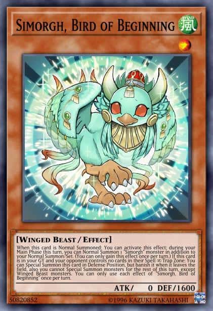 When this card is Normal Summoned: You can activate this effect; during your Main Phase this turn, you can Normal Summon 1 “Simorgh” monster in addition to your Normal Summon/Set. (You can only gain this effect once per turn.) If this card is in your GY and your opponent controls no cards in their Spell & Trap Zone: You can Special Summon this card in Defense Position, but banish it when it leaves the field, also you cannot Special Summon monsters for the rest of this turn, except Winged Beast monsters. You can only use each effect of “Simorgh, Bird of Beginning” once per turn.