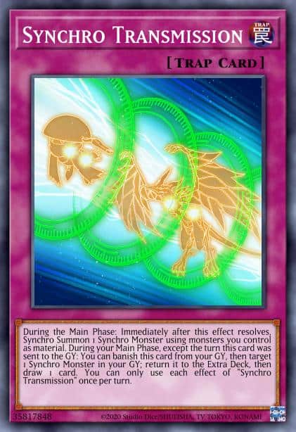 During the Main Phase: Immediately after this effect resolves, Synchro Summon 1 Synchro Monster using monsters you control as material. During your Main Phase, except the turn this card was sent to the GY: You can banish this card from your GY, then target 1 Synchro Monster in your GY; return it to the Extra Deck, then draw 1 card. You can only use each effect of “Synchro Transmission” once per turn.