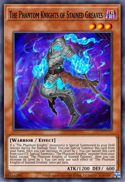 If a “The Phantom Knights” monster(s) is Special Summoned to your field (except during the Damage Step): You can Special Summon this card from your hand, then you can increase the Level of this card by 1. You can banish this card from your GY; Special Summon 1 “The Phantom Knights” monster from your hand, except “The Phantom Knights of Stained Greaves”, then you can increase its Level by 1. You can only use each effect of “The Phantom Knights of Stained Greaves” once per turn.