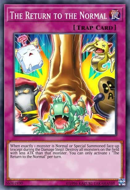 When exactly 1 monster is Normal or Special Summoned face-up (except during the Damage Step): Destroy all monsters on the field with less ATK than that monster. You can only activate 1 “The Return to the Normal” per turn.