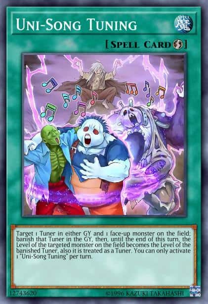 Target 1 Tuner in either GY and 1 face-up monster on the field; banish that Tuner in the GY, then, until the end of this turn, the Level of the targeted monster on the field becomes the Level of the banished Tuner, also it is treated as a Tuner. You can only activate 1 “Uni-Song Tuning” per turn.